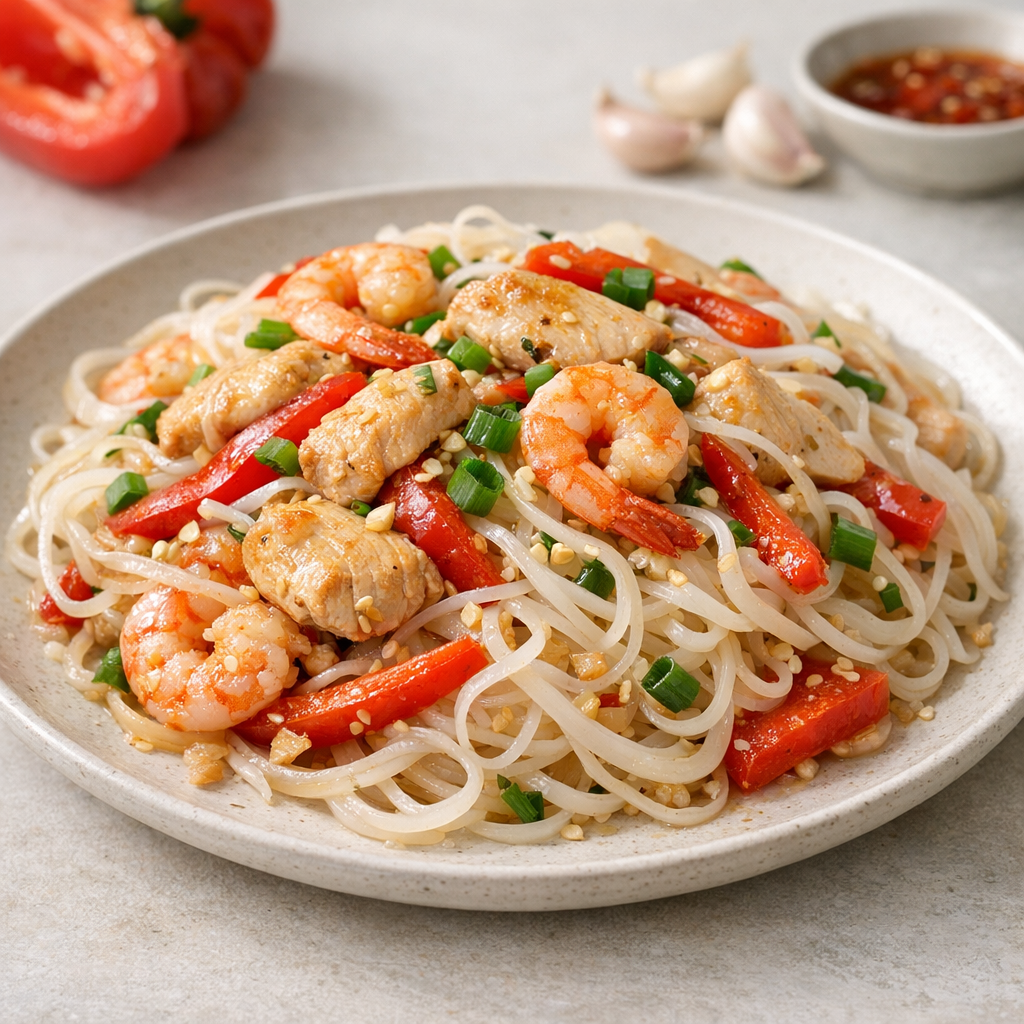 - Kook de rijstnoedels volgens de aanwijzingen op de verpakking, spoel af met koud water en zet apart.