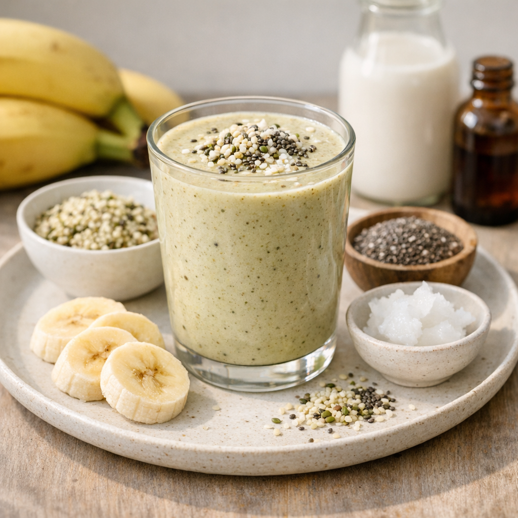De zachte zoetheid van banaan en het nootachtige van hennepzaad zorgen voor een frisse smoothie. Je proeft een lichte crunch; perfect als licht ontbijt.