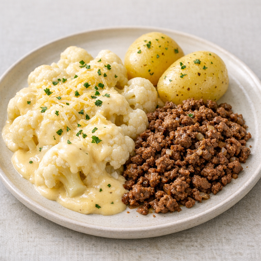 Deze Hollandse maaltijd combineert bloemkool met een romige saus van lactosevrije kaas en melk, en mager rundergehakt. Alles wordt volledig glutenvrij en lactosevrij bereid, zodat je zorgeloos kunt genieten van een heerlijke, vertrouwde AVG-maaltijd.