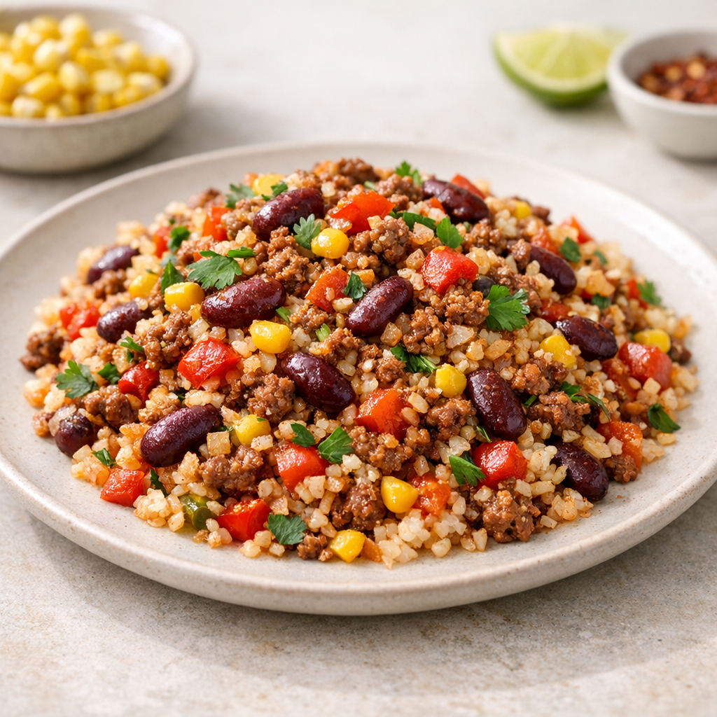 Bloemkoolrijst, gekruid gehakt en bonen zorgen hier voor een snelle, vullende Mexicaanse maaltijd. Een handje groenten maakt het lekker vol. Het geheel past in je dag en is makkelijk vol te houden door de simpele bereiding.