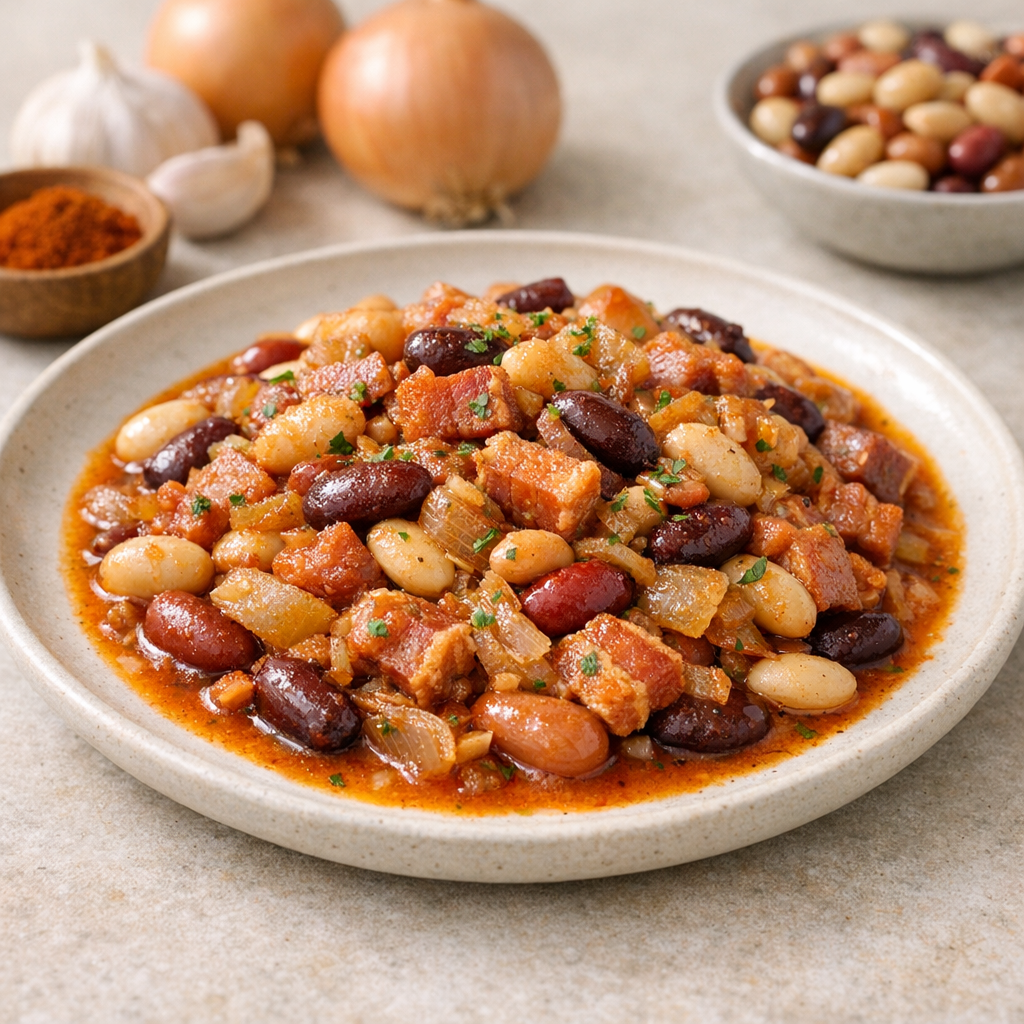 Deze bonenstoof met spek en ui is een hartige en troostrijke maaltijd boordevol smaak. Langzaam gegaard spek, zoete uien en stevige bonen worden gecombineerd in een rijke glutenvrije groentebouillon en op smaak gebracht met gerookt paprikapoeder. Dankzij het gebruik van koemelkvrije lactosevrije boter is dit gerecht volledig geschikt voor een glutenvrije en lactosevrije voeding. Het eindresultaat is een eenvoudig te bereiden, verwarmend ovengerecht dat heerlijk is bij het diner en perfect voor meal prep.