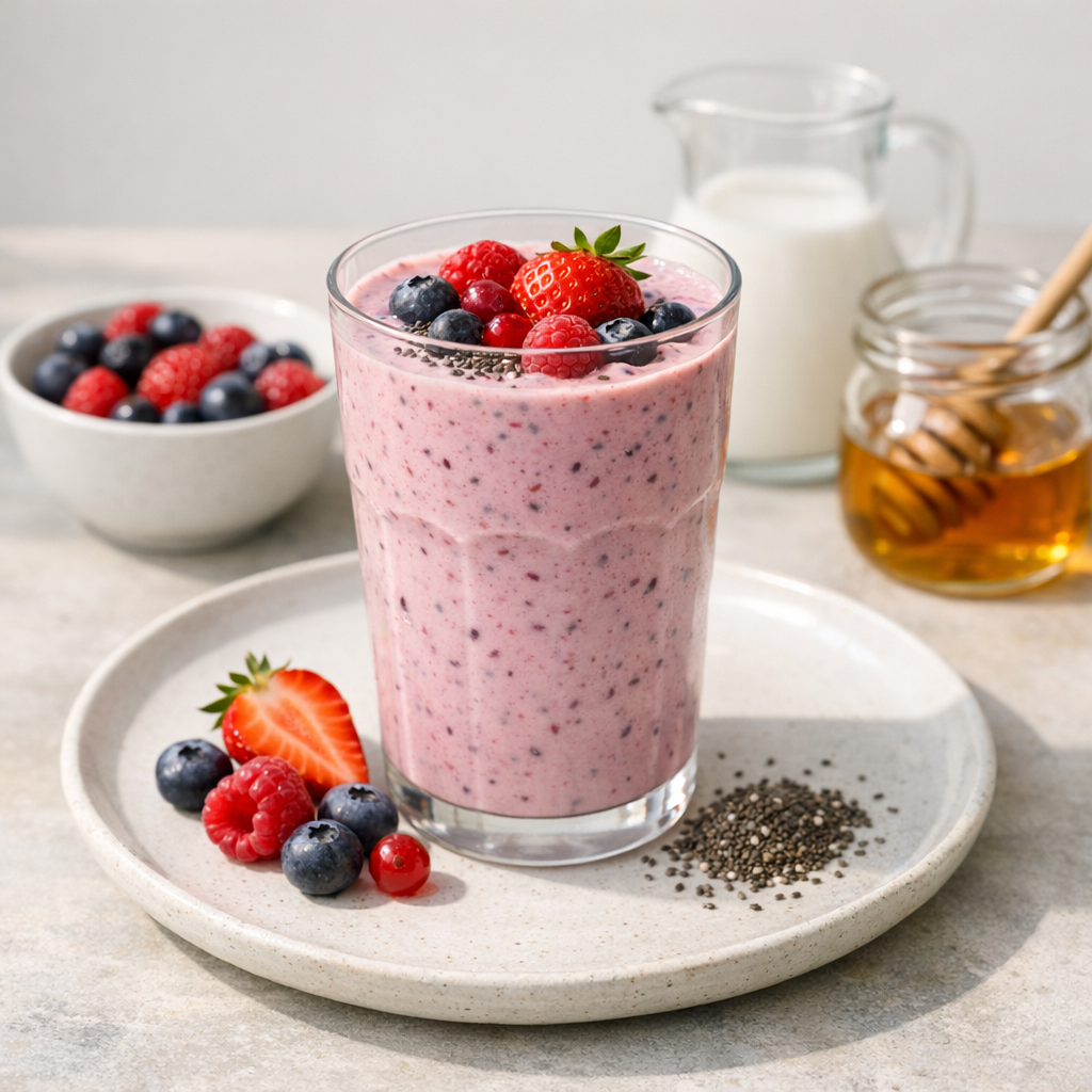 Deze shake combineert frisse bosvruchten met romige lactosevrije Skyr, ongezoete amandelmelk en chiazaad voor een eiwitrijk en zacht ontbijt. Agavesiroop voegt een milde zoetheid toe. Geniet van een smaakvolle en voedzame start van de dag zonder zorgen over lactose of andere ongewenste ingrediënten.