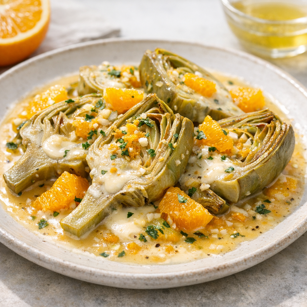 Dit gerecht combineert zacht gestoofde artisjokken met de frisse smaak van sinaasappel. Het is een mooi voorbeeld van een glutenvrij bijgerecht dat met eenvoudige ingrediënten gemaakt wordt. Voor een traditionele toets kan een scheutje lactosevrije room worden toegevoegd, wat het gerecht extra romig maakt.