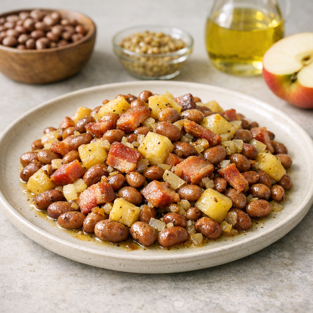 Een eenvoudig gerecht van bruine bonen met spek en appel. Het combineert de hartige smaak van spek met het frisse van appel. Lekker voor het avondeten en makkelijk vooraf te bereiden.