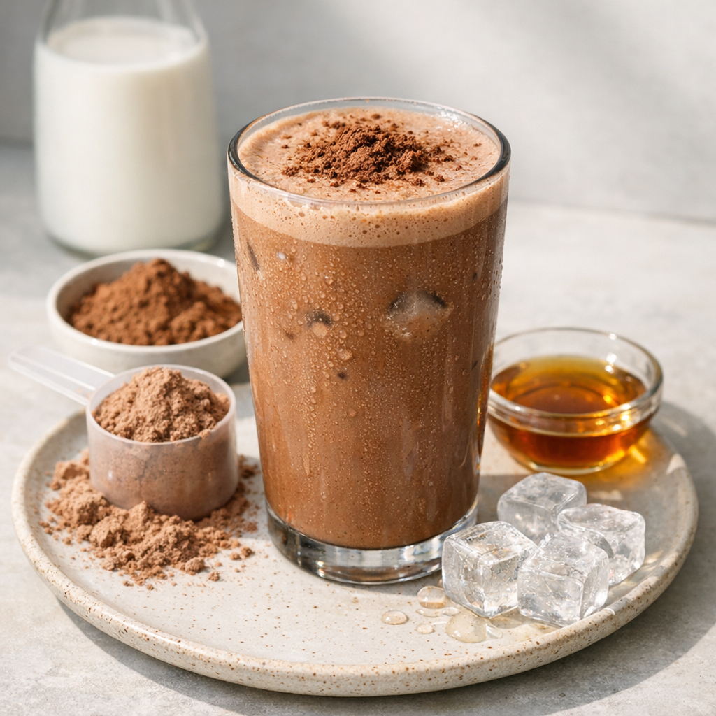 Een romige chocolade shake met een volle, rijke smaak en zachte textuur die helpt bij spierherstel. Het is makkelijk vol te houden, past goed in je dag en is zonder gedoe te bereiden.