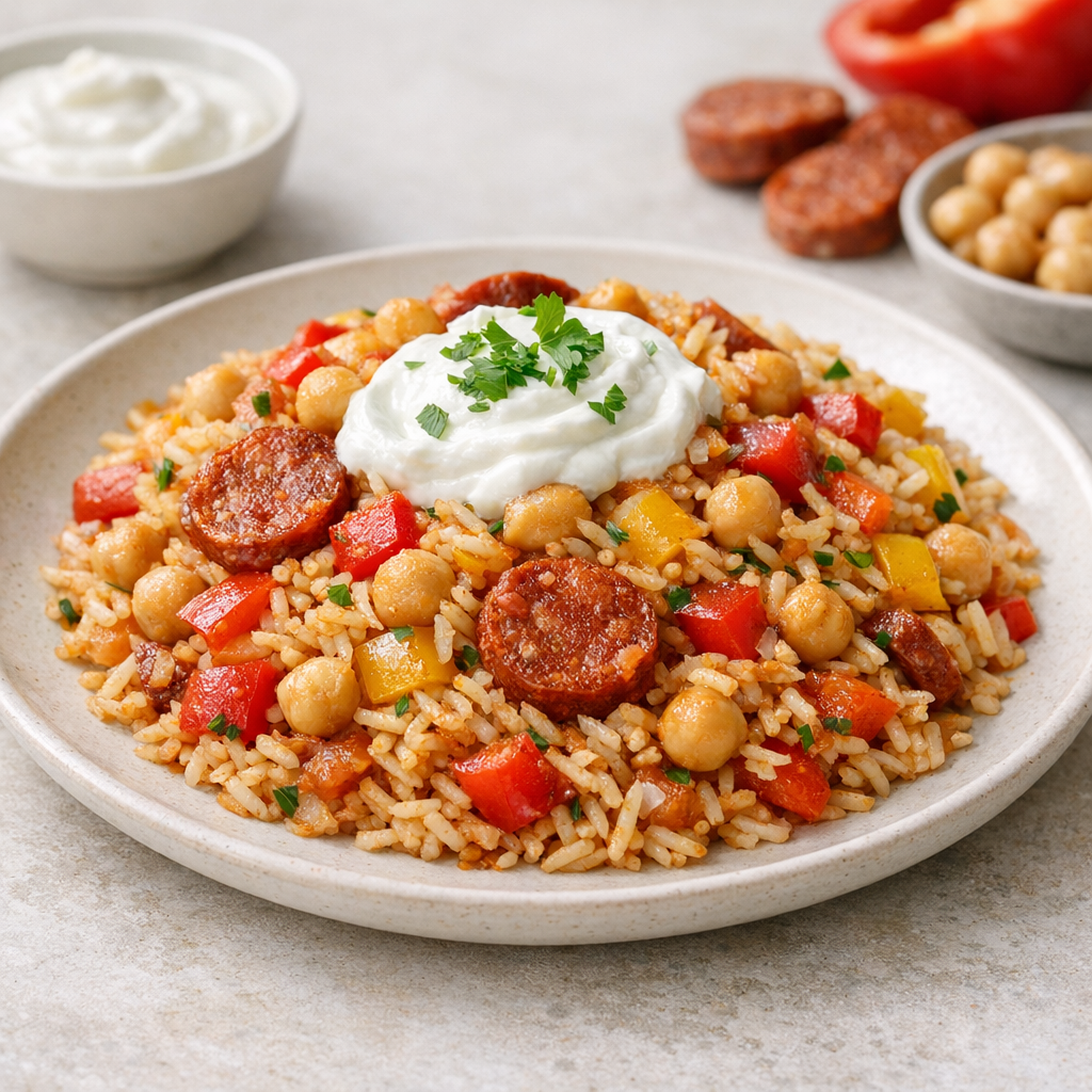 In deze stevige rijstpan bak je pittige chorizo samen met kikkererwten en paprika voor een volle smaak. Het gerecht maak je in één pan, wat praktisch en duidelijk is. Lekker rustig en makkelijk vol te houden tijdens drukke avonden.