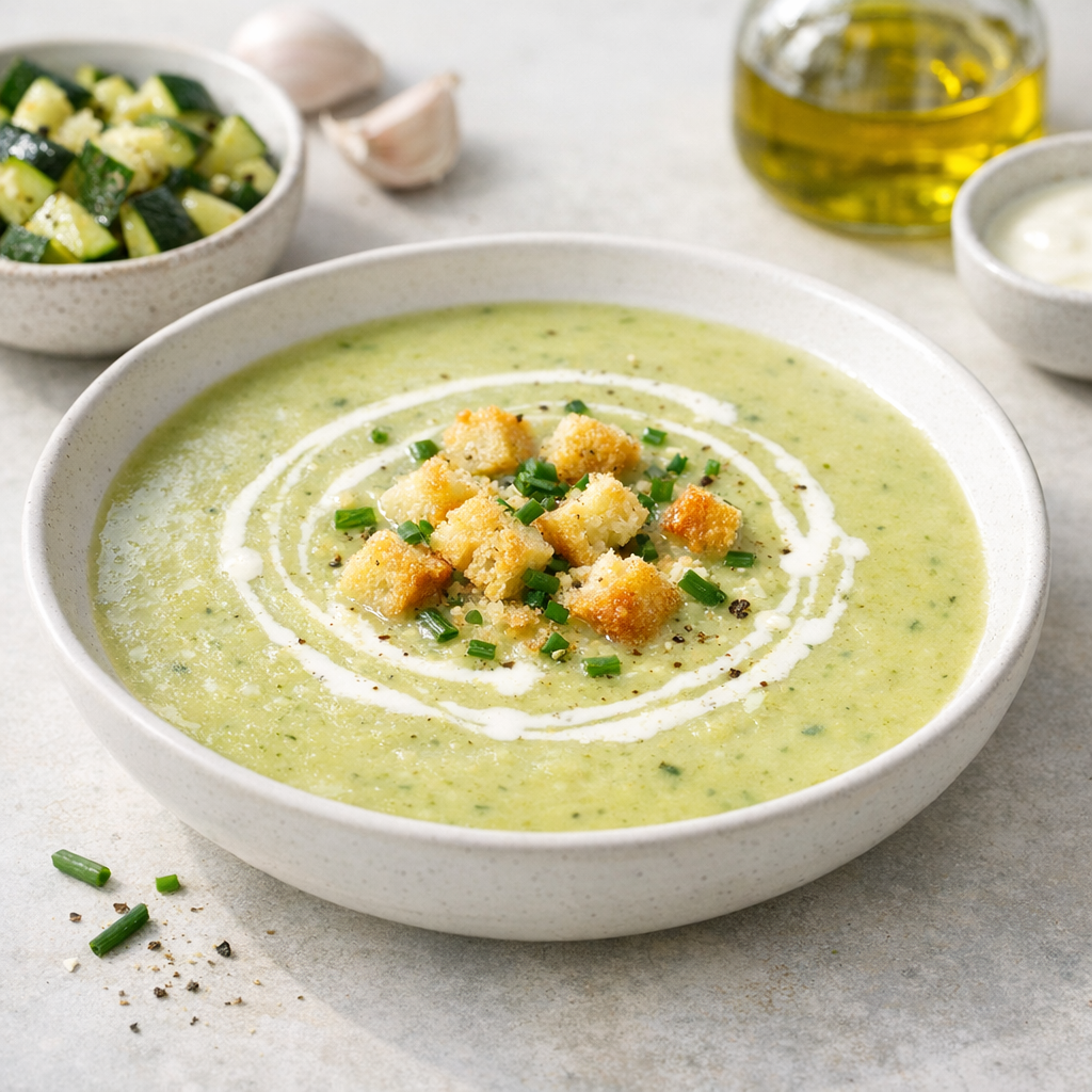 Deze fluweelzachte courgettesoep heeft een frisse, milde smaak en staat snel op tafel als lichte maaltijd of voorgerecht. Gemaakt met glutenvrije groentebouillon en lactosevrije room, zodat iedereen zorgeloos kan genieten.