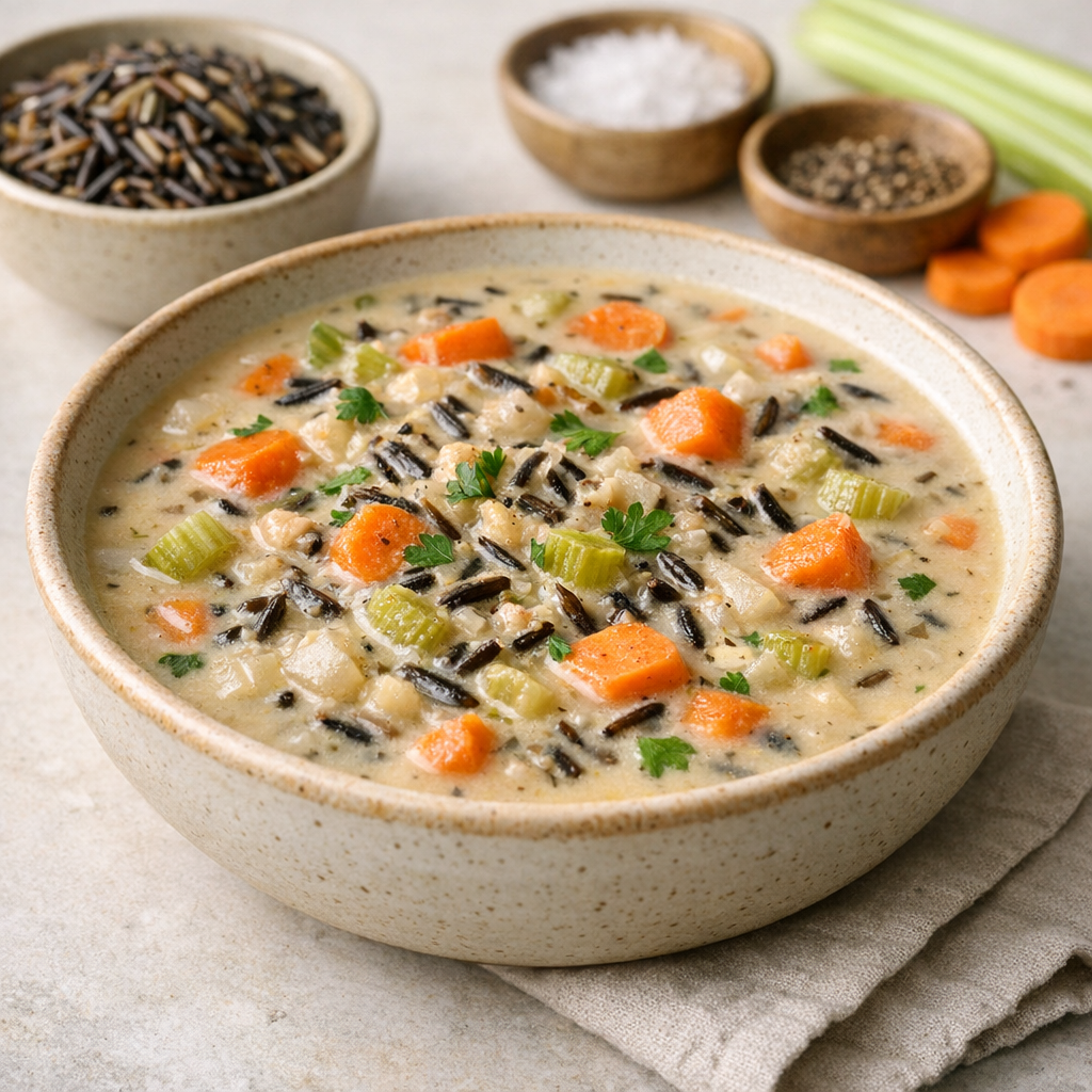 Deze romige wilde rijstsoep is een verwarmende en voedzame optie voor koude dagen. De soep is glutenvrij en gemaakt zonder zuivel; voor een romige textuur gebruik je plantaardige melk. Het recept is eenvoudig te maken en geschikt voor een geruststellende maaltijd.