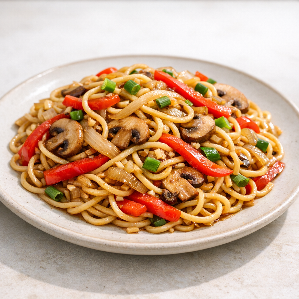 Een zacht noedelgerecht met groenten in een sojasausachtige dressing. Ondanks dat de noedels gluten bevatten, blijft het recept praktisch en duidelijk voor een snelle maaltijd.