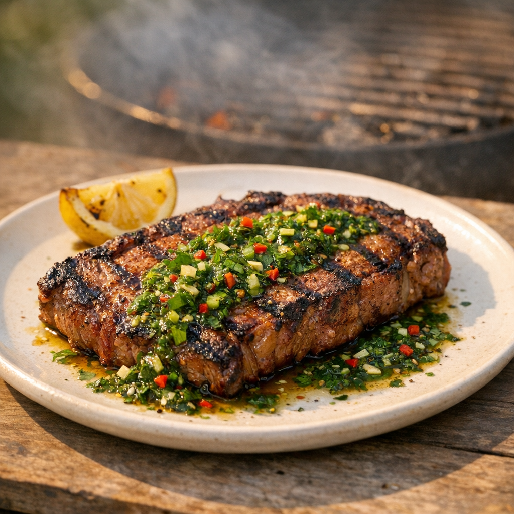 Sappige entrecote van de grill samen met een frisse, kruidige chimichurri. Je krijgt een stevige vleessmaak met een lichte toets van kruiden.
