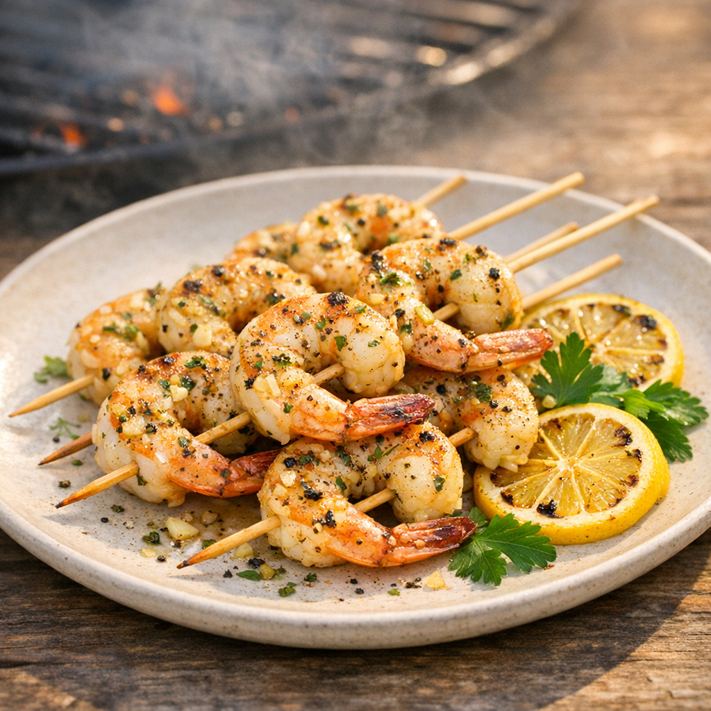 Garnalen aan een spies worden fris door de citroen en kruiden, en krijgen een lichte, knapperige bite. Het is een helder en aantrekkelijk gerecht van de grill.