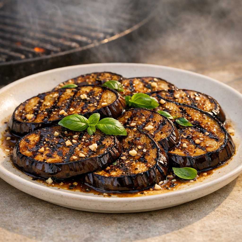 Gegrilde aubergine, gemarineerd in balsamico en olijfolie, krijgt een zachte en rijke smaak. Dit licht bijgerecht past goed bij Mediterrane maaltijden.
