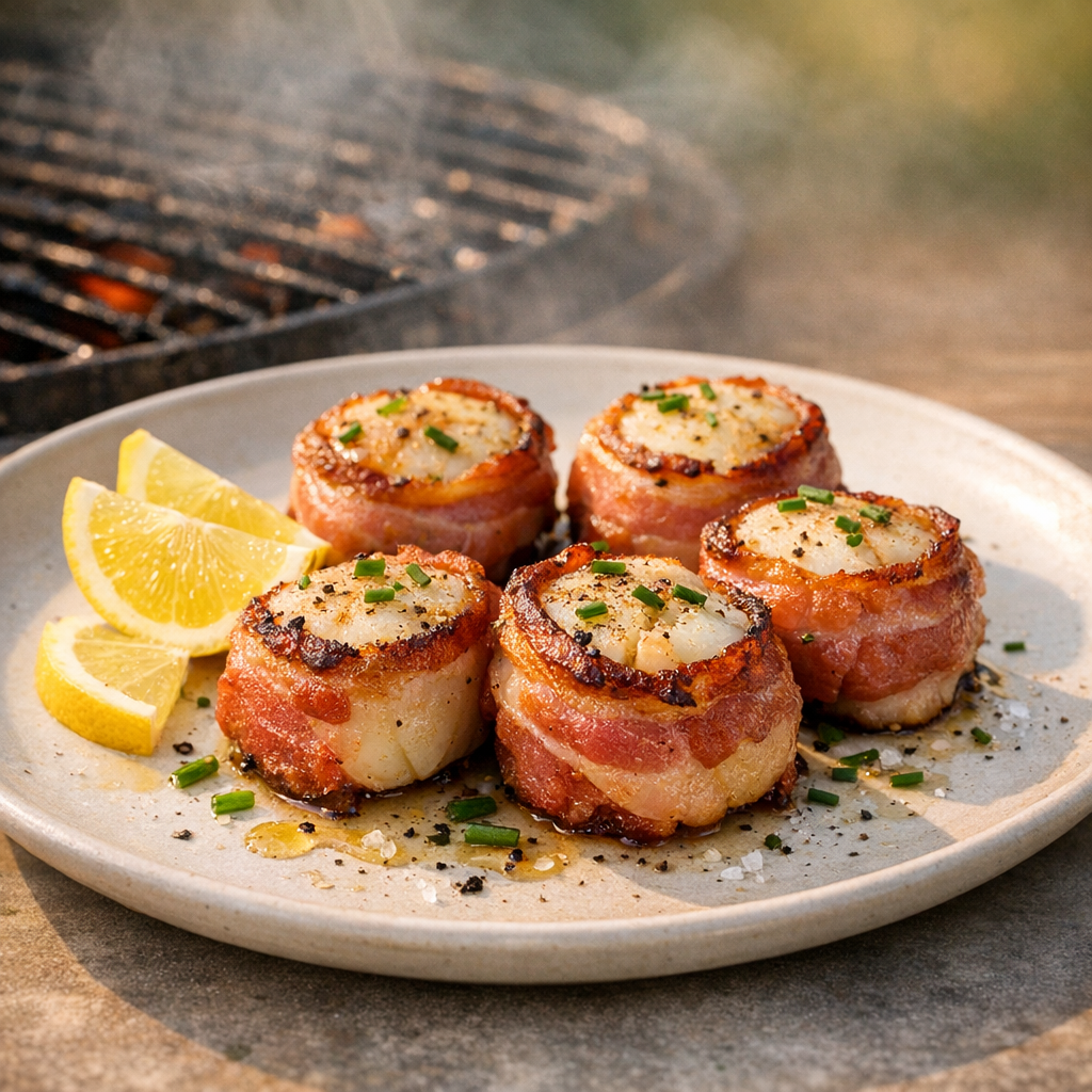 Je grilt coquilles kort samen met krokant spek voor een frisse, zilte smaak. Dit lichte voorgerecht is eenvoudig en snel klaar.