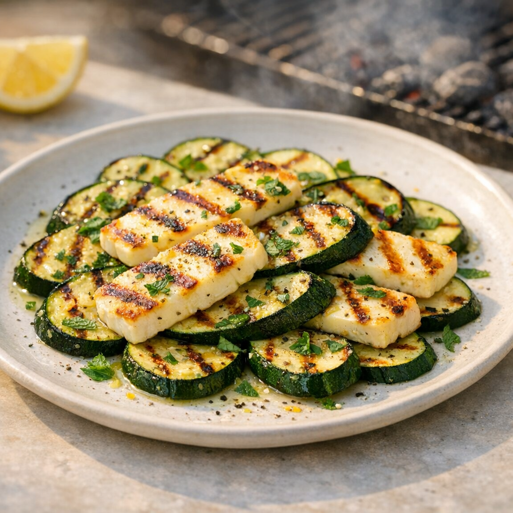 Gegrilde courgette en halloumi geven een hartige en licht zoute smaak. Mediterrane kruiden zorgen voor frisse accenten.