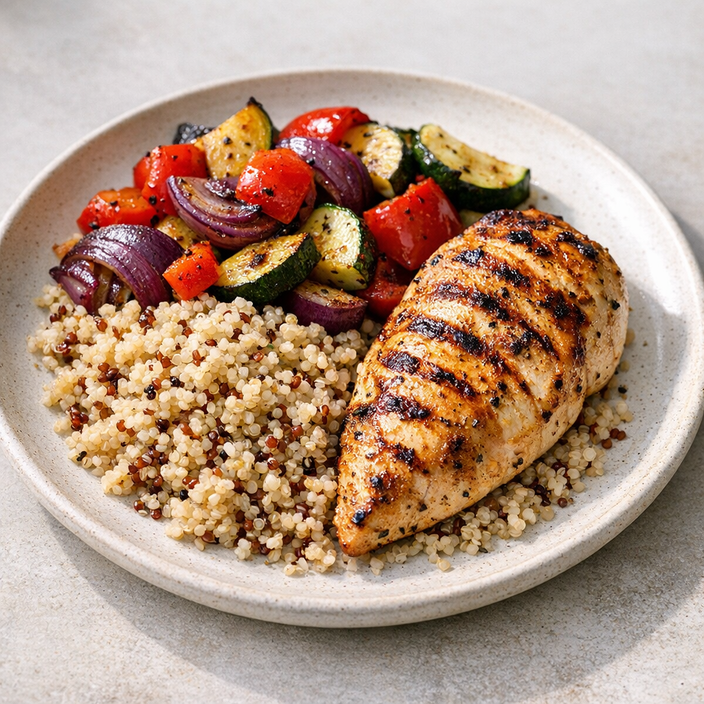 Je eet malse gegrilde kipfilet met quinoa, samen met warme, knapperige groenten uit de oven. De lichte kruiden en verschillende texturen maken het een smaakvolle en voedzame maaltijd.