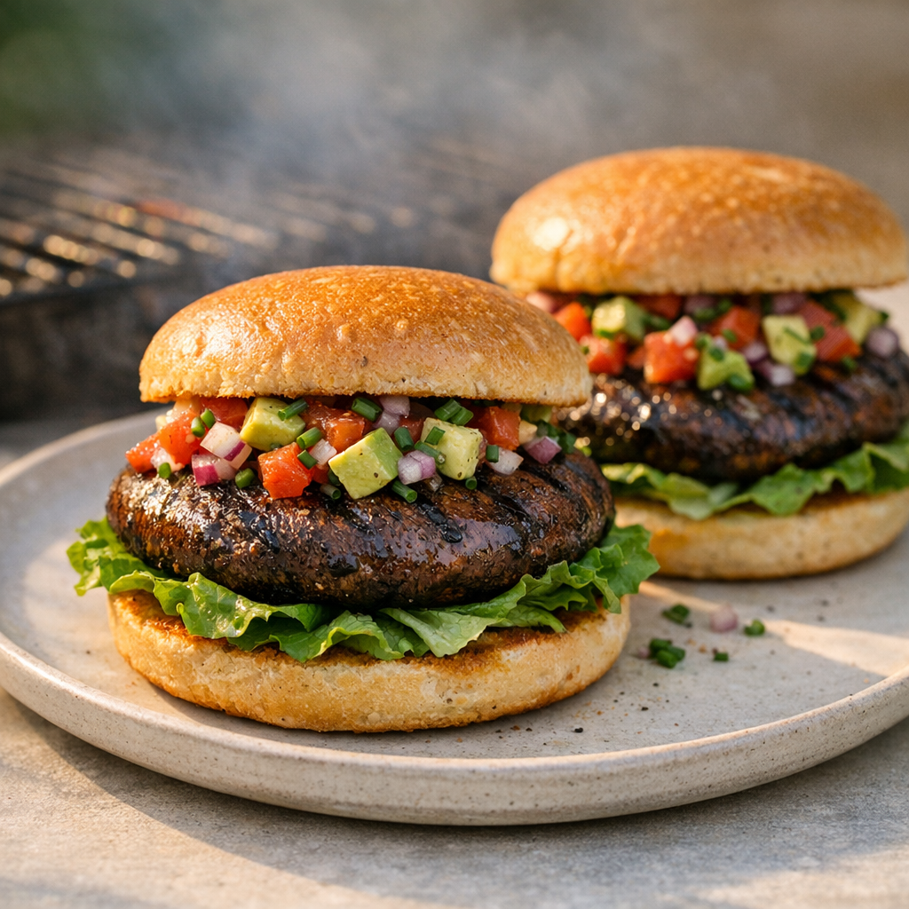 Gegrilde portobello champignons vormen een hartige burger met een frisse topping. Je eet een smaakvolle vegetarische lunch die goed vult zonder zwaar te zijn.