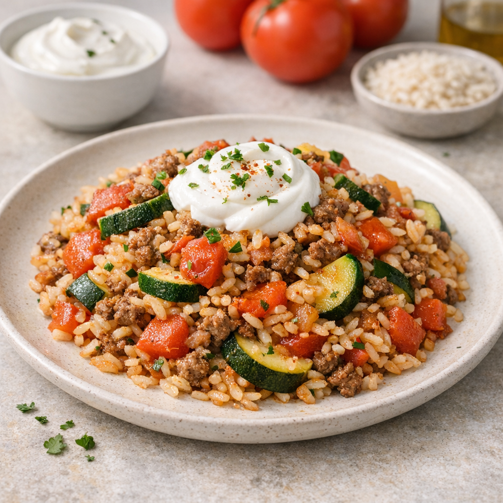 Dit diner brengt gekruid gehakt, gebakken courgette en tomaten samen met rijst in één kommetje. Je hoeft alleen maar alles in één pan te bereiden, zonder gedoe. Past in je dag en vult goed.