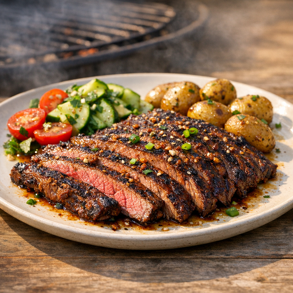 Flank steak krijgt een hartige smaak door de marinade en wordt snel gegrild. Je ervaart malse structuur en een stevige bite.