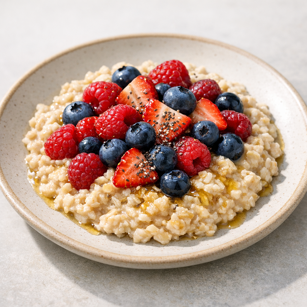 Begin je dag met een romige en voedzame glutenvrije havermout, rijk aan verse bessen en gezoet met honing. Dit ontbijt is snel klaar en geeft je een frisse start van de ochtend.