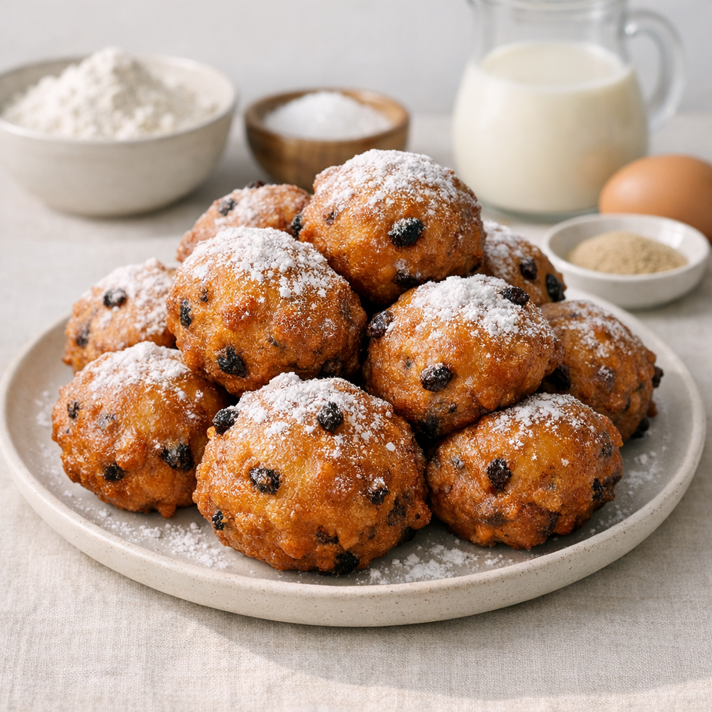 Deze oliebollen maak je eenvoudig zelf met een mix van rozijnen en plantaardige melk. Het beslag laat je rijzen, waarna je de oliebollen goudbruin bakt in olie. Serveer ze warm en bestrooi ze met poedersuiker.