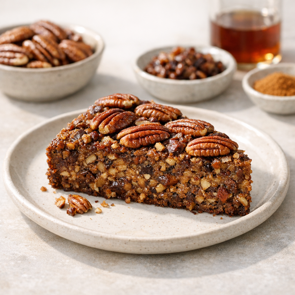 Deze pecannotentaart zonder korst heeft een volle, nootachtige smaak en een zachte, bijna smeuïge textuur. Je maakt hem eenvoudig in de oven voor bij de koffie of als dessert.