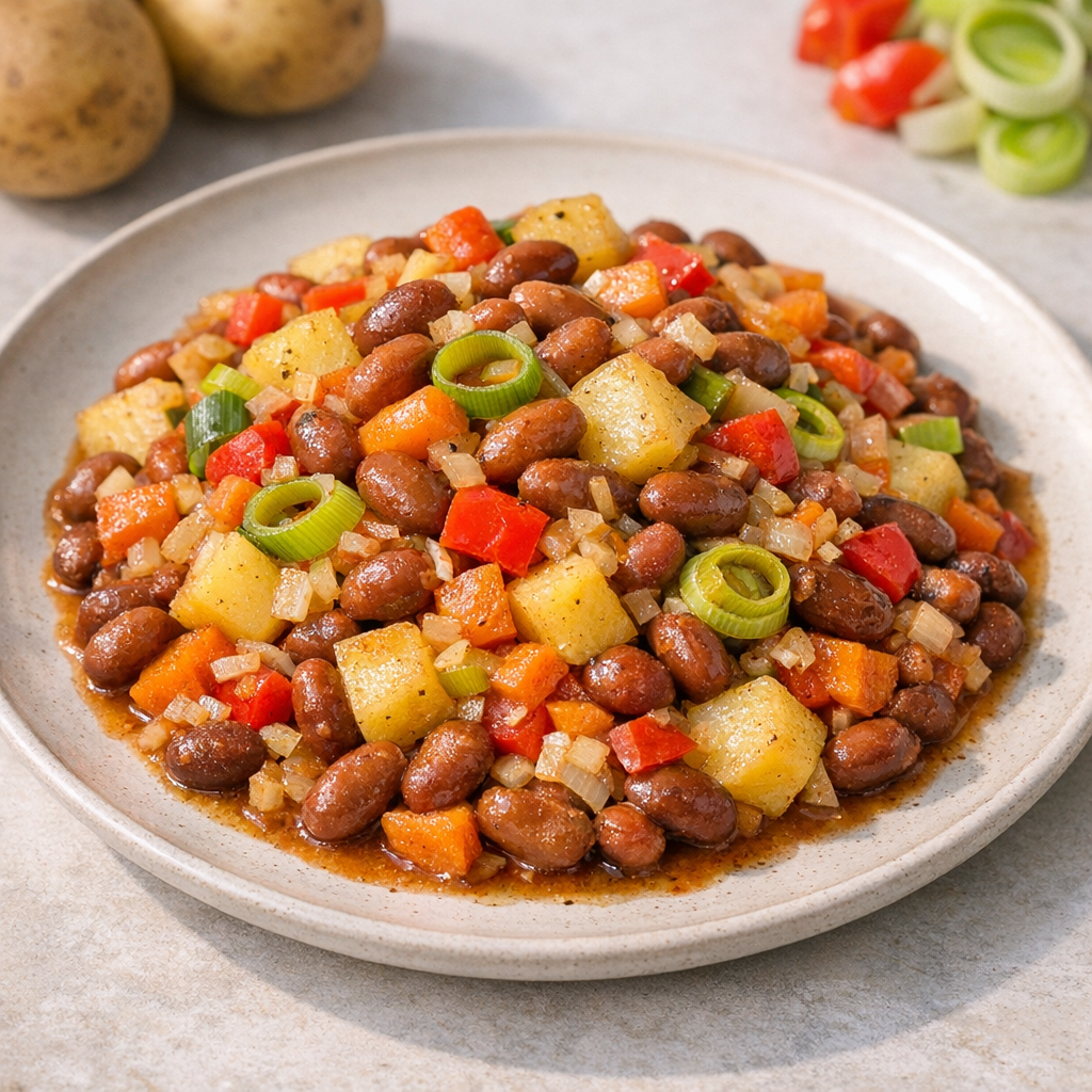 Bruine bonen, aardappel en groenten vormen samen een stevig eenpansgerecht, makkelijk te bereiden op een doordeweekse avond. Het gerecht is verwarmend en gewoon haalbaar voor het gezin, alles in één pan. Lekker rustig een voedzame maaltijd koken.