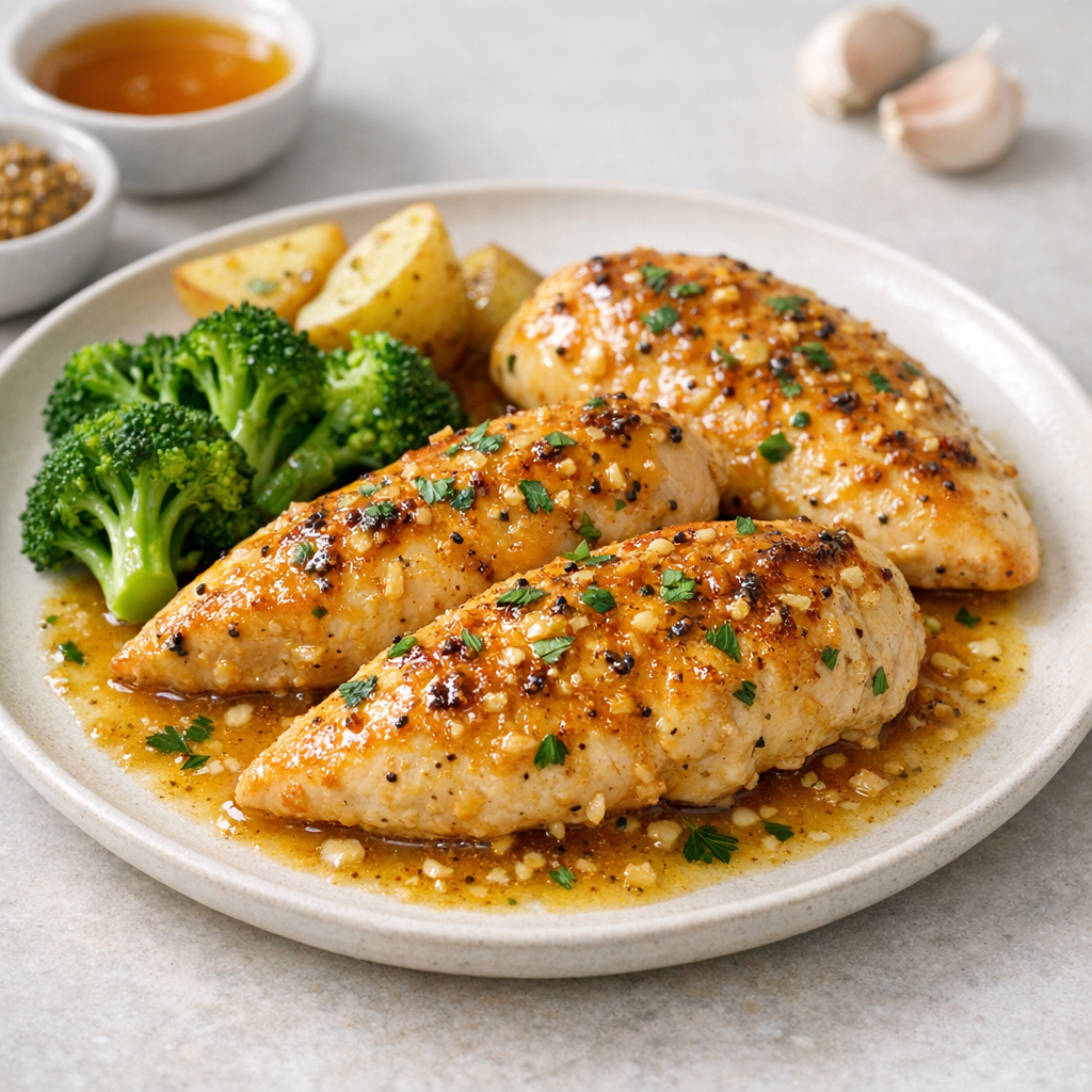 Knapperige kip uit de oven met een zachte honing-mosterdsaus, rijk van smaak. Het gerecht is duidelijk en praktisch te maken.