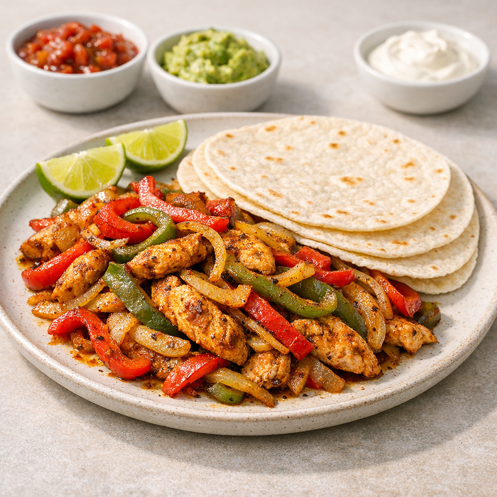 Malse kip met paprika en ui, geserveerd in zachte tortilla’s. Snel klaar voor een doordeweekse avond met een beetje pit. Pak lactosevrije room.