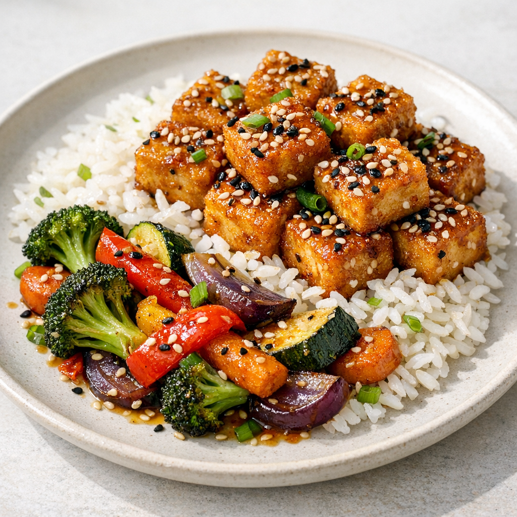 Tofu uit de oven met een krokant jasje, geroosterde groenten en een hartige sesamsaus. Een voedzame maaltijd met duidelijke, praktische stappen.