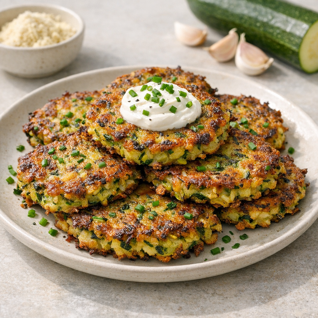 Deze fritters zijn licht en krokant met een milde smaak van courgette. De structuur is luchtig, de bereiding eenvoudig, en ze zijn snel klaar voor de lunch.