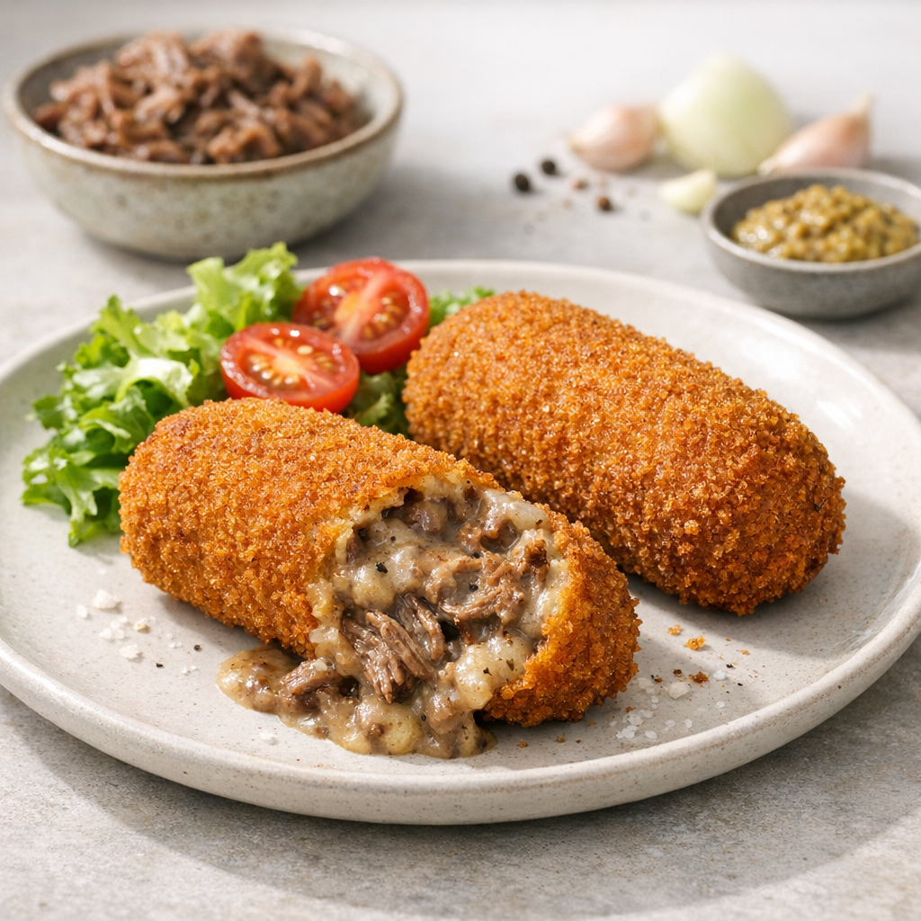 Kroketten met rundvlees worden gevuld met een smeuïge ragout, op smaak gebracht met ui, nootmuskaat en peper. Ze zijn eenvoudig te maken en geschikt voor de lunch of als snack. Frituur ze tot ze goudbruin en krokant zijn.