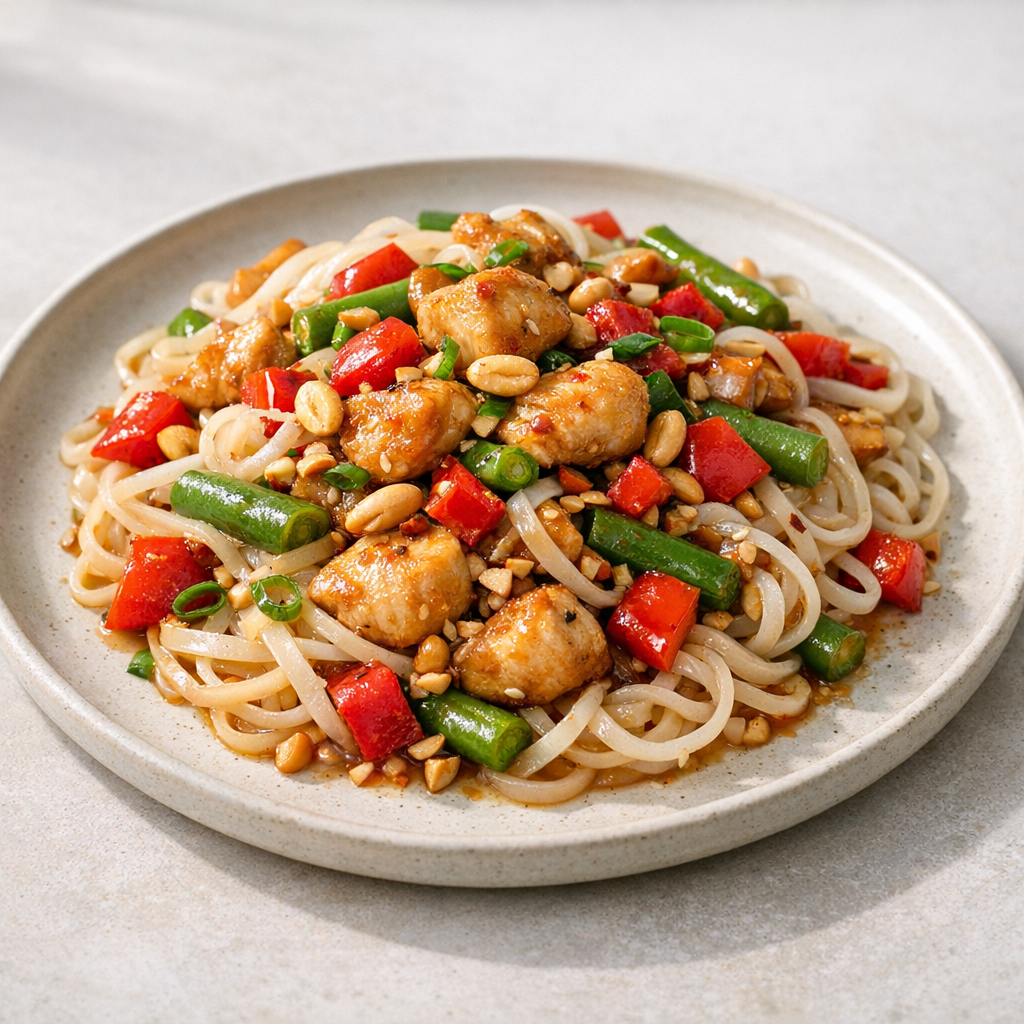 Deze roerbak combineert malse kip met zachte noedels en een kruidige pittige saus. Je zet zo een warme, smaakvolle maaltijd op tafel.