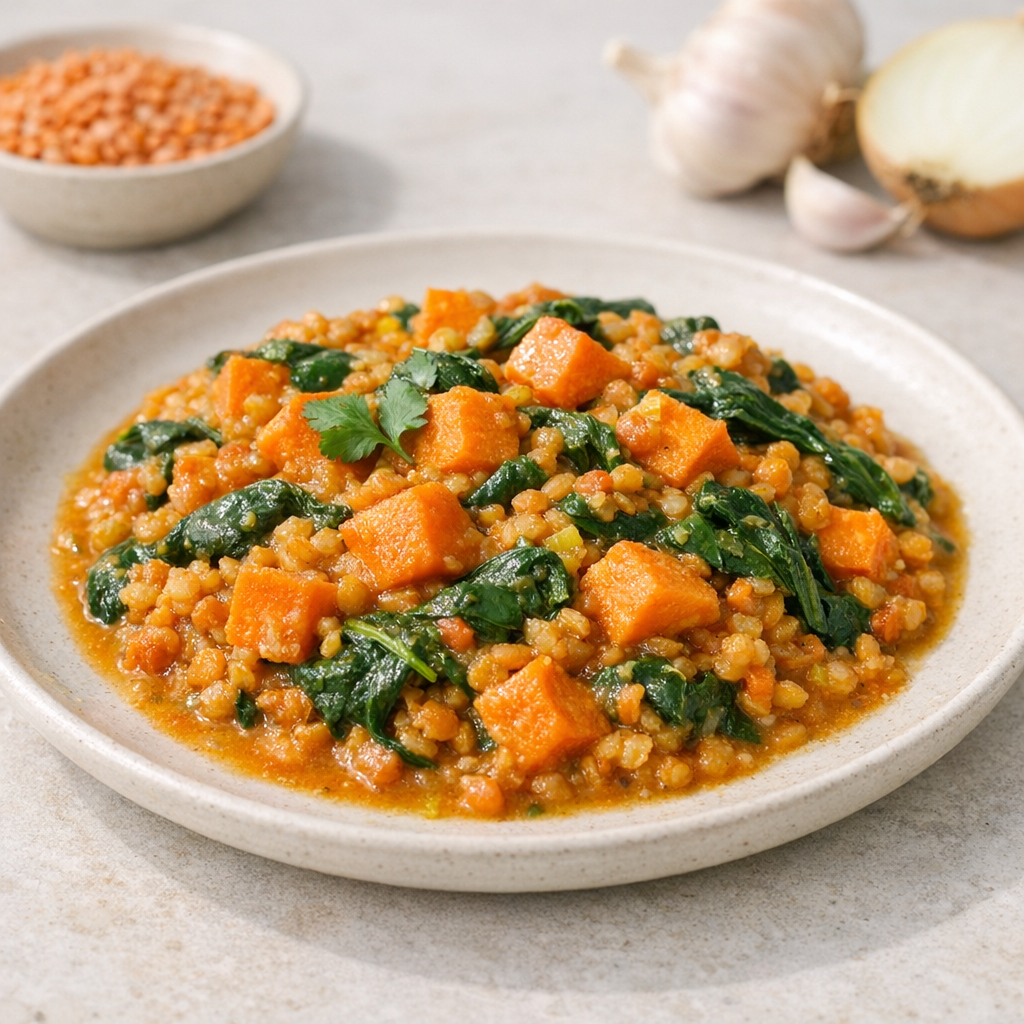 Linzencurry met zoete aardappel en spinazie