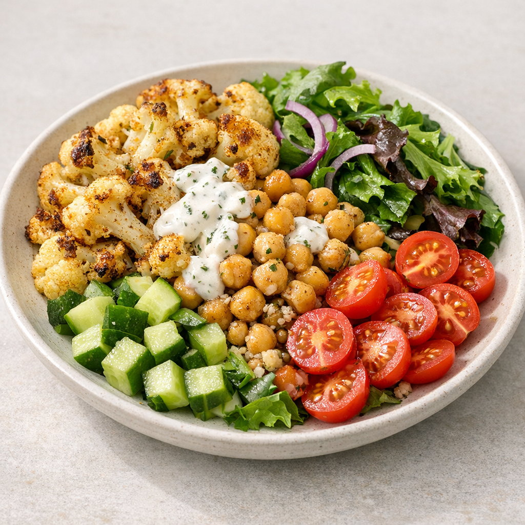 - Verdeel de sla over vier kommen, voeg de geroosterde bloemkool en kikkererwten toe, leg er de verse groenten bij en lepel de dressing erover.