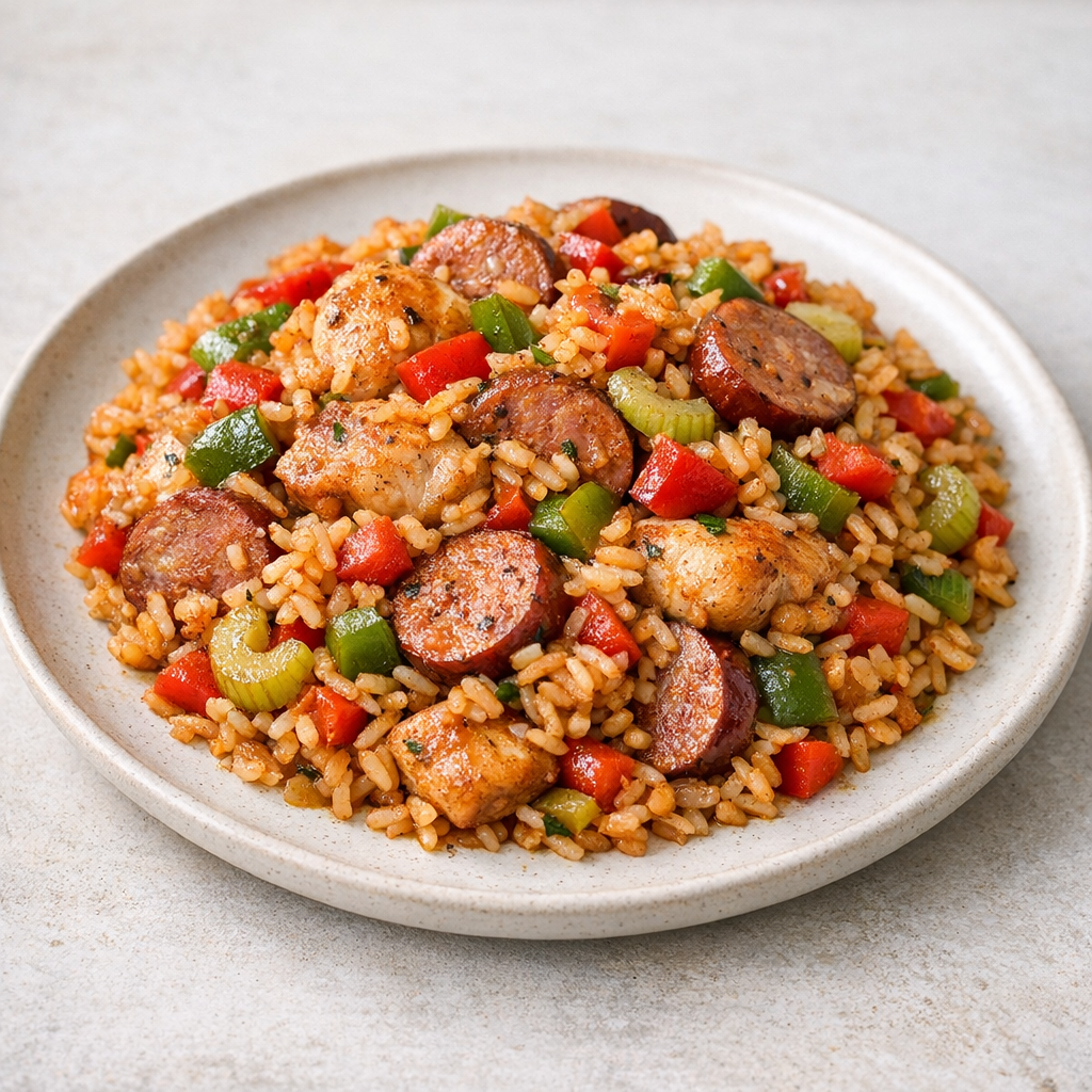 In deze eenpans jambalaya kook je rijst, kip, paprika en specerijen samen tot een volle maaltijd. De smaken trekken goed in en je hebt weinig afwas. Dit gerecht is zonder gedoe te maken en vult goed.