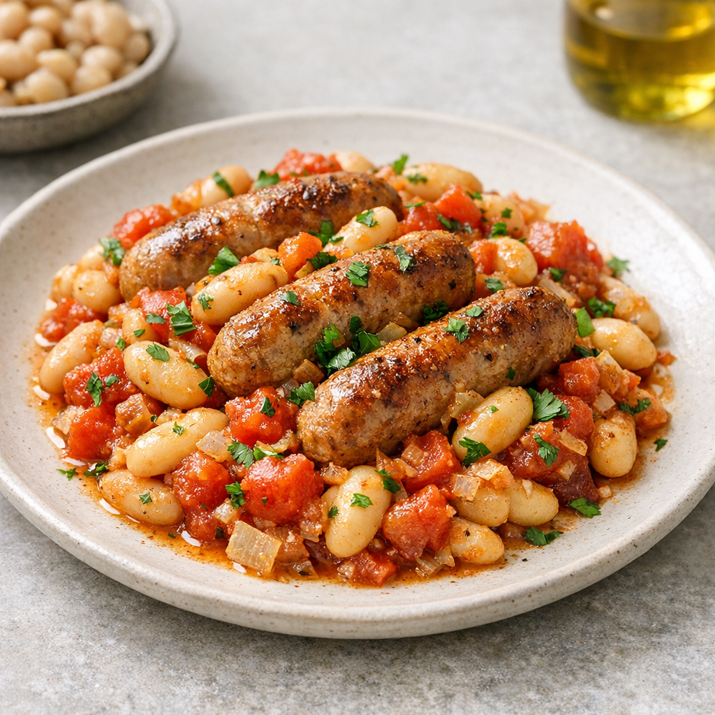 Deze ovenschotel met glutenvrije worst, witte bonen en tomaat is een eenvoudige en voedzame maaltijd. De combinatie van goed gekruide worst, romige witte bonen en sappige tomaten zorgt voor een heerlijk vullend gerecht. Alles wordt in de oven gegaard en afgemaakt met verse peterselie voor extra smaak. Perfect voor een zorgeloze, glutenvrije maaltijd.