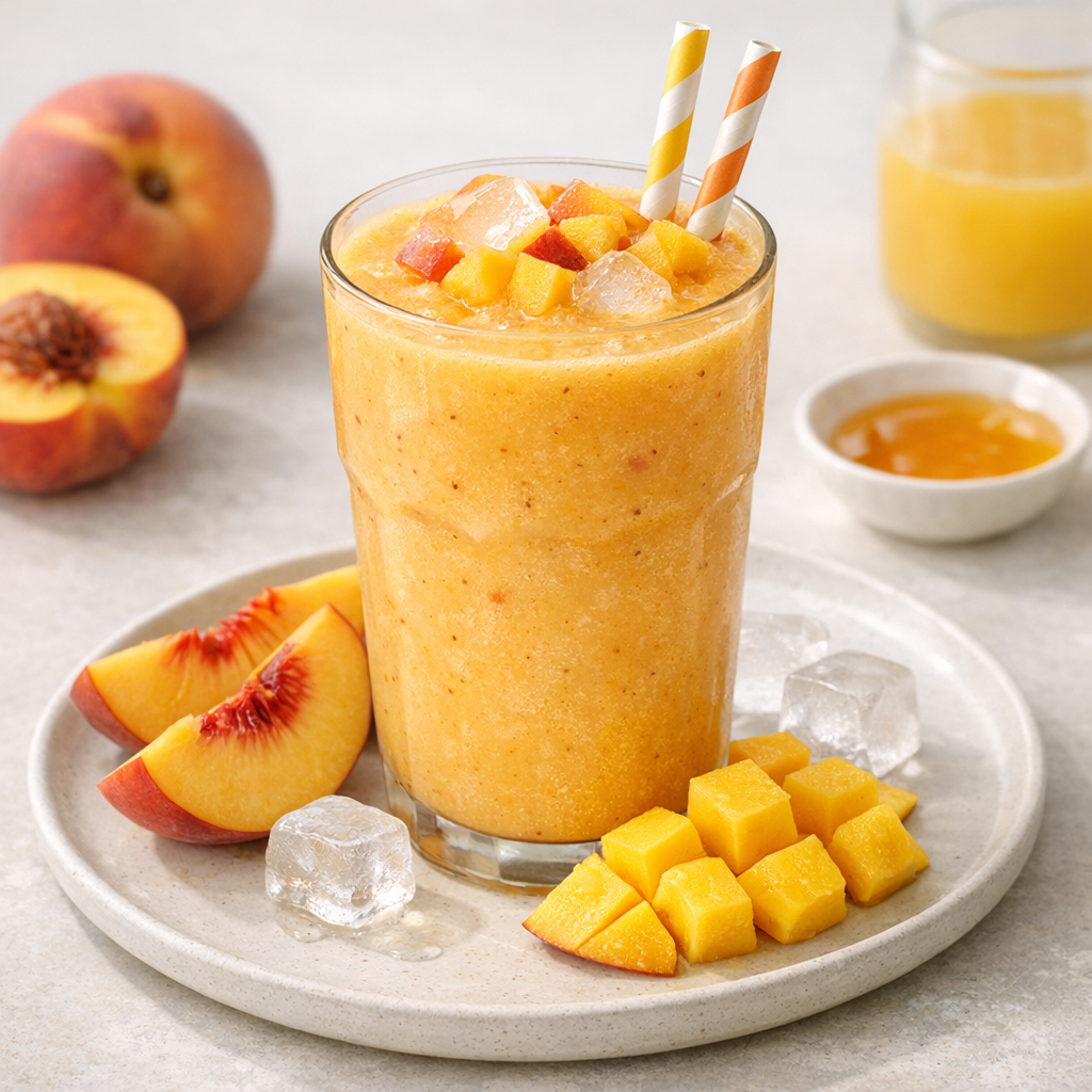 Deze smoothie mixt sappige perzik met frisse fruittonen en is snel klaar. De lichte, zachte smaak maakt het een aangename keuze voor tussendoor.
