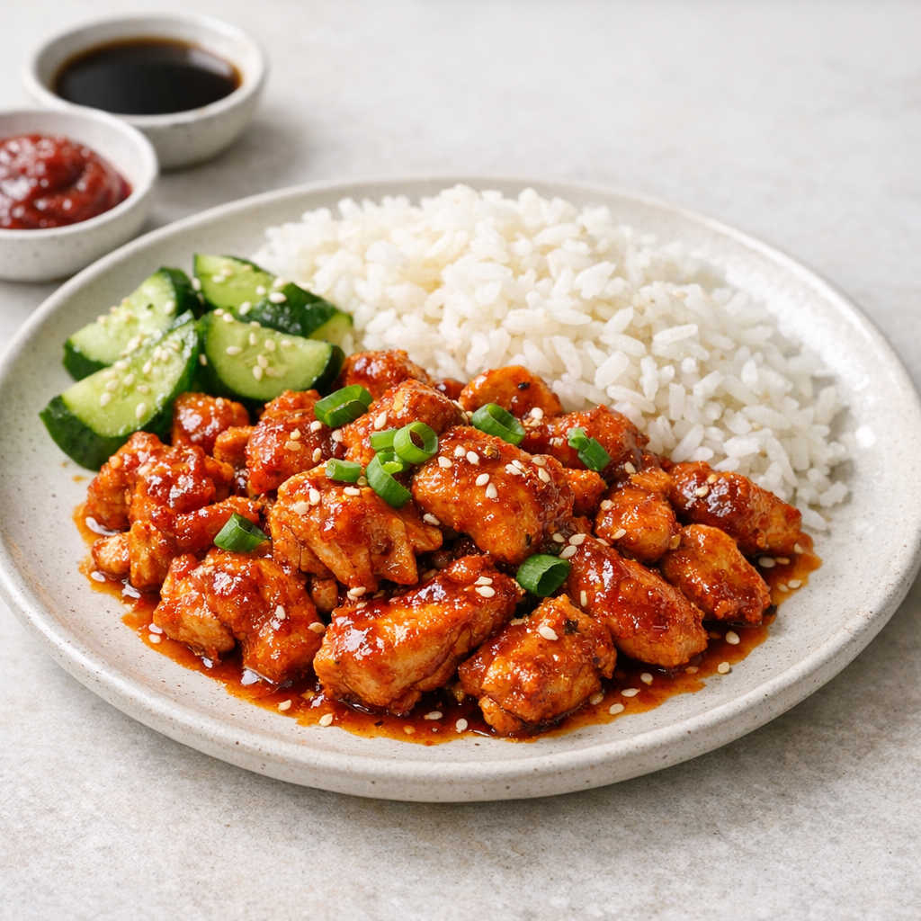 Deze kip wordt geserveerd in een warme, pittige gochujangsaus. Praktisch en smaakvol voor wie houdt van kruidige gerechten.