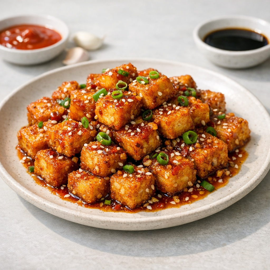 - Verhit olie in een pan en bak de tofu rondom goudbruin en knapperig.