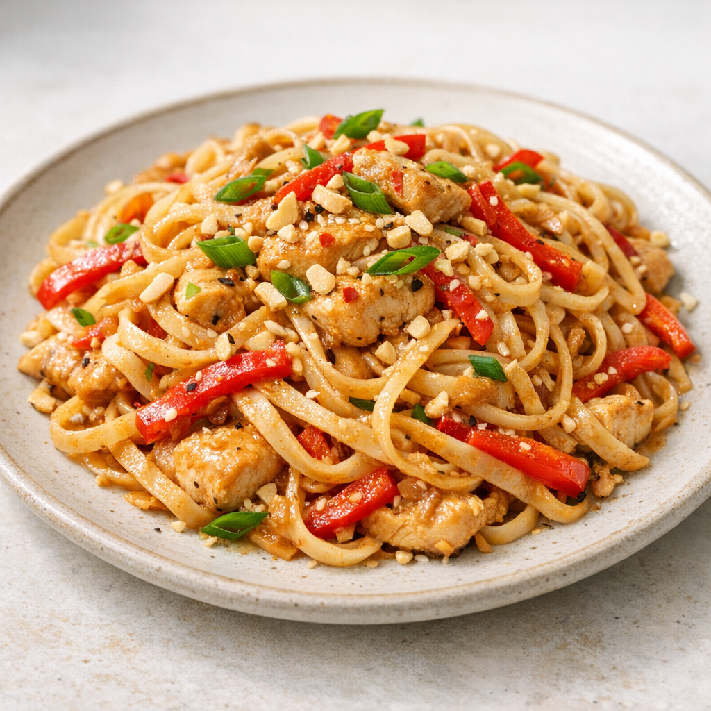Malse kip en romige pindasaus geven deze noedels een volle, pittige smaak. Een voedzame warme maaltijd die je eenvoudig bereidt.