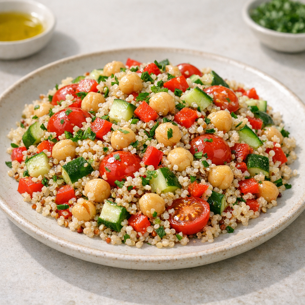 Deze salade combineert frisse groenten, quinoa en kikkererwten. Het is een voedzame lunch die snel te bereiden is en goed vult.