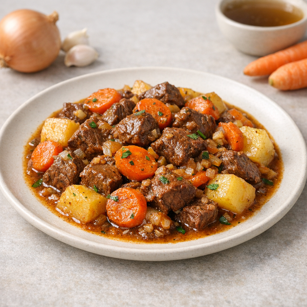 Een stevige stoof met rundvlees, wortel en aardappel, vol smaak. Dit gerecht is overzichtelijk om te maken en past goed bij een dagelijkse maaltijd.