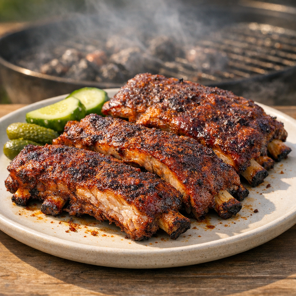 Spareribs met een pittige dry rub worden langzaam gegaard, waardoor het vlees sappig en vol smaak is. De kruidige korst geeft het vlees extra diepte.