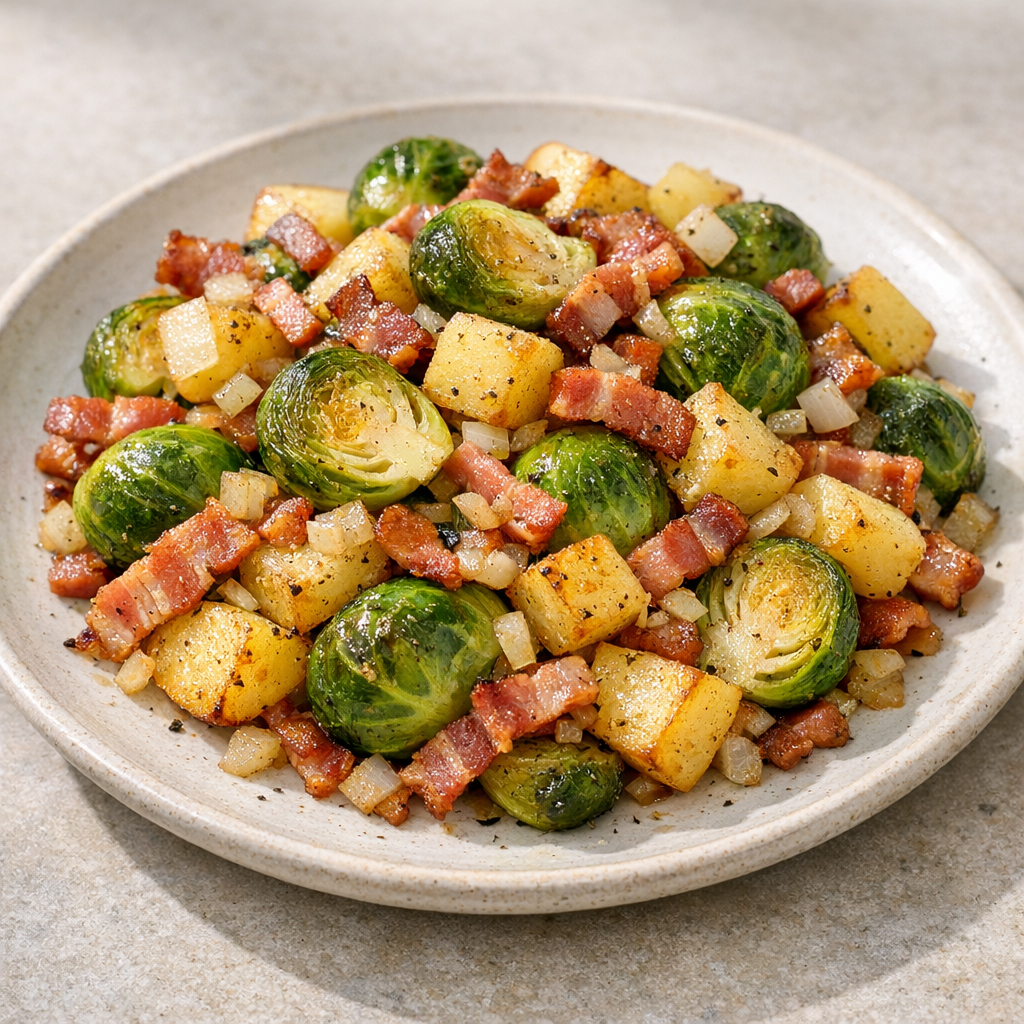 Dit ovengerecht combineert spruitjes met krokant spek en zachte aardappelblokjes voor een stevige, warme maaltijd. Alles wordt samen met ui, olijfolie, zout en peper gemengd en in de oven gebakken tot het goudbruin en gaar is. Het resultaat is een smaakvolle, voedzame schotel die direct op tafel kan.
