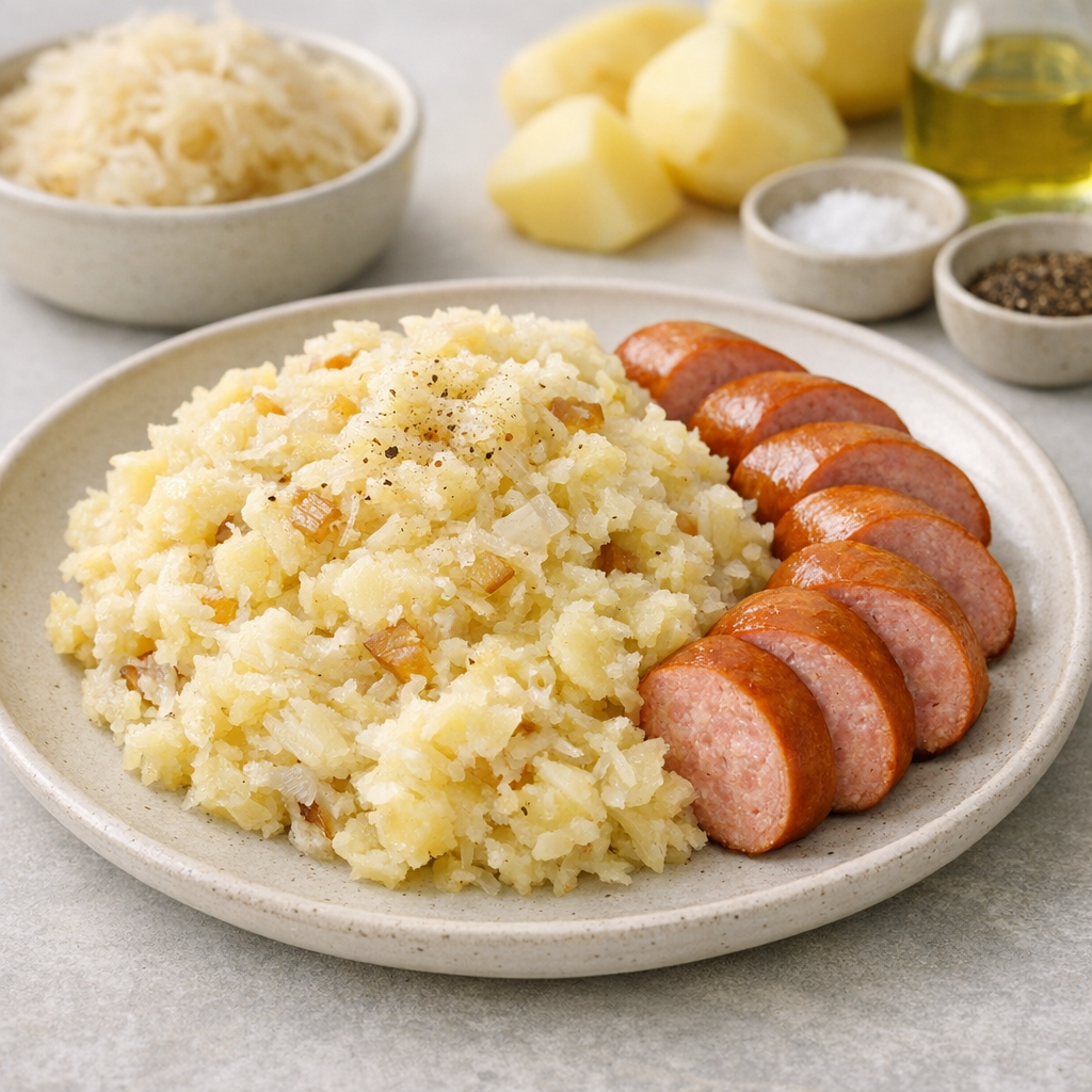 - Meng de zuurkool en ui door de gestampte aardappelen en breng op smaak met peper en zout.