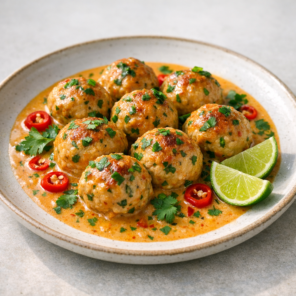 Kipballetjes in een romige Thaise currysaus met een lichte kruidigheid. Deze maaltijd is verwarmend en voedzaam tegelijk.