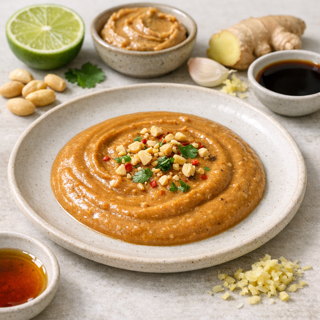 - Meng pindakaas, sojasaus, limoensap, ahornsiroop, knoflook en gember in een kom.