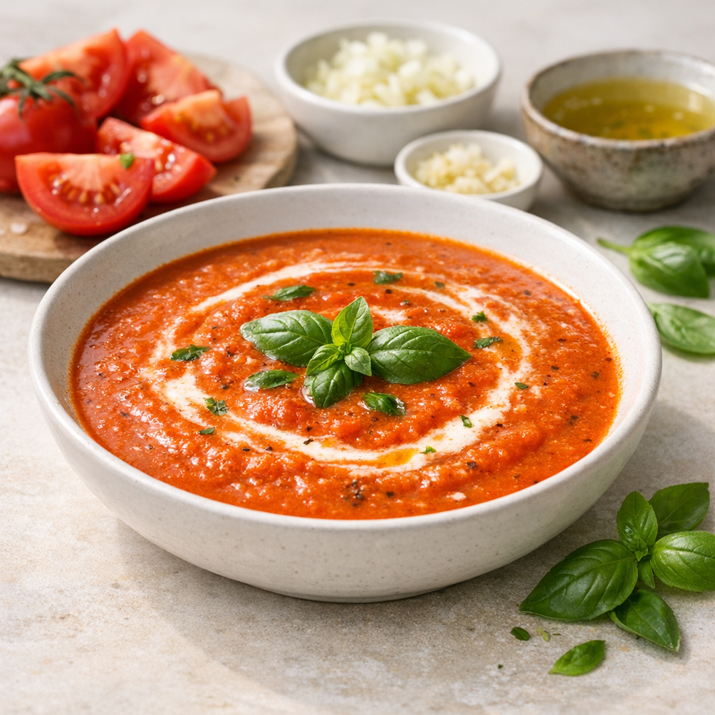 Deze tomatensoep smaakt vol en fris door basilicum en een beetje pit. De soep is fijn overzichtelijk, romig en licht, waardoor hij goed vult zonder zwaar te zijn. Maak hem gerust als snelle, lichte maaltijd.