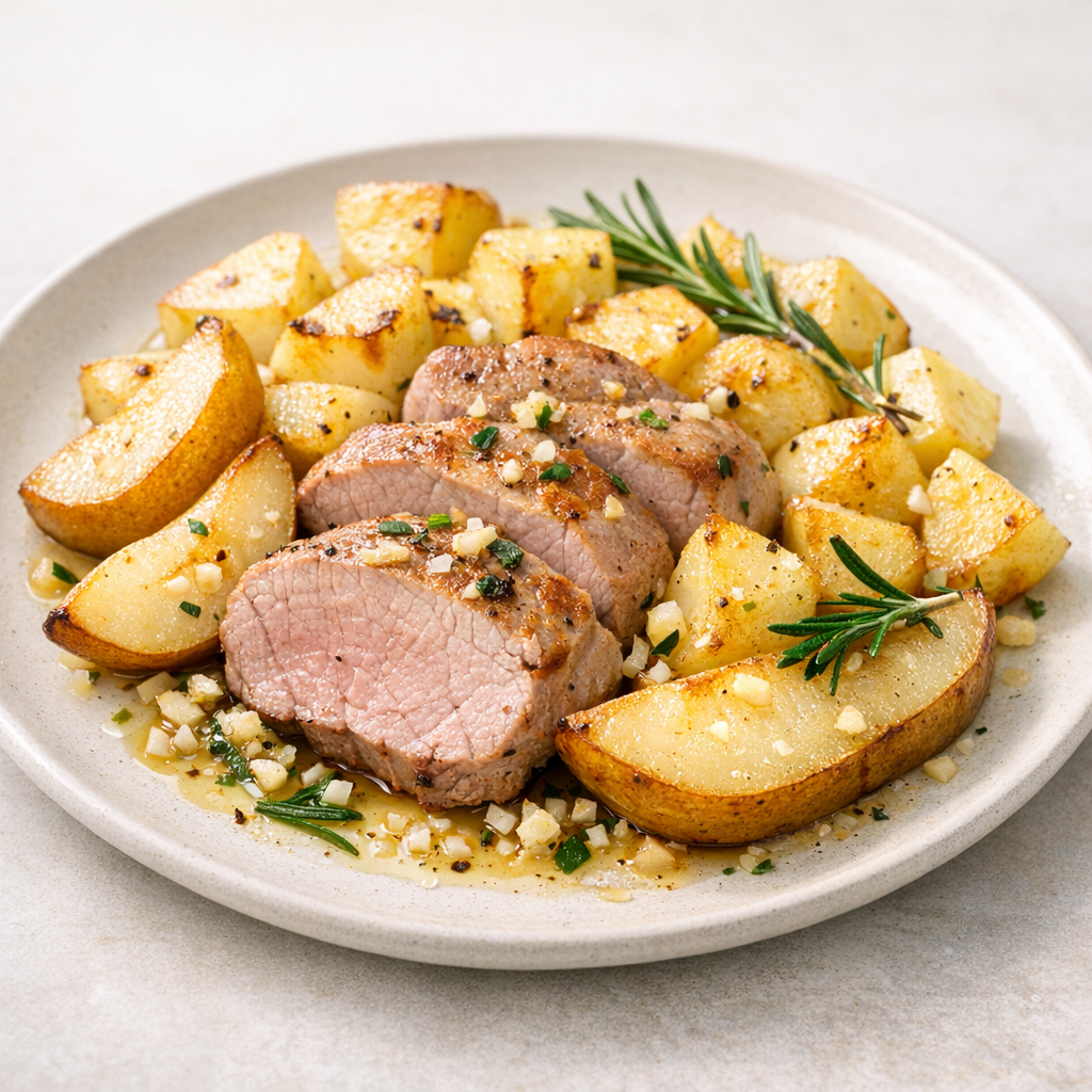 Malse varkenshaas combineert hier met de natuurlijke zoetheid van peer en knapperige aardappel. Het frisse van de peer maakt het gerecht licht en smaakvol.