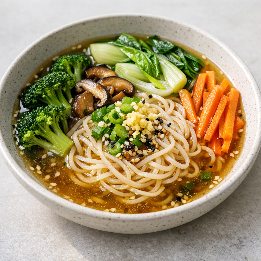 Geniet van deze veganistische ramennoedels met een rijke, plantaardige en glutenvrije bouillon, gevuld met knapperige groenten en glutenvrije ramennoedels. Het gerecht is licht, vol van smaak en eenvoudig te bereiden. Ideaal als voedzame maaltijd voor het diner.